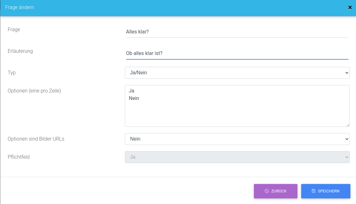 - „Typ“: Die Art der Frage bzw. wie diese zu beantworten ist. Einfacher Text, Ja/Nein, Eine-von-Vielen, Multiple-Choice
